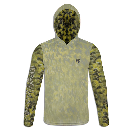 Crappie Jig - Unisex Long Sleeve Sun Proof Performance Fishing Top with built in Hoodie and Gaiter (short sleeve option also available)