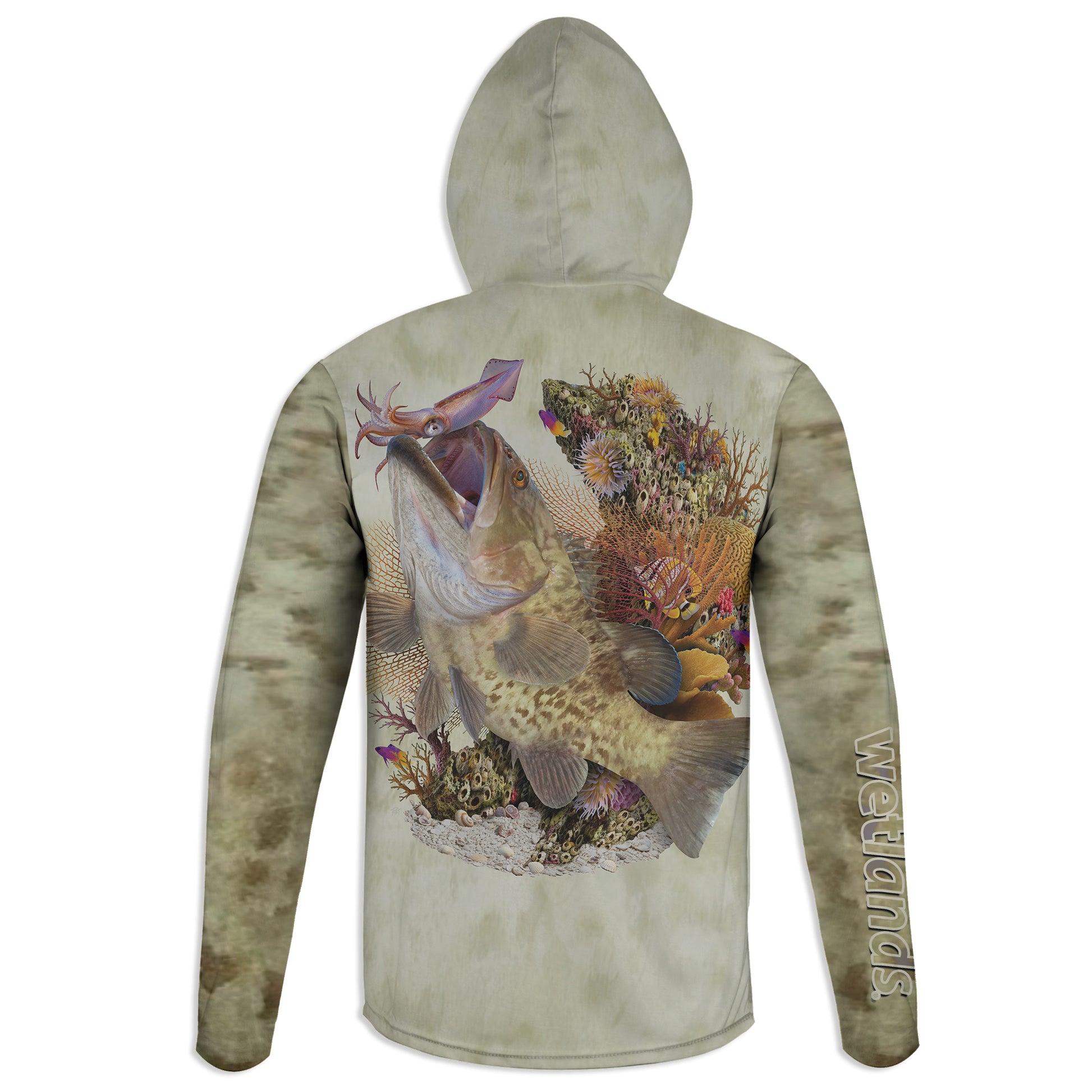 Gag Grouper and Squid- Unisex Long Sleeve Sun Proof Performance Fishing Top with built in Hoodie and Gaiter (short sleeve option also available)